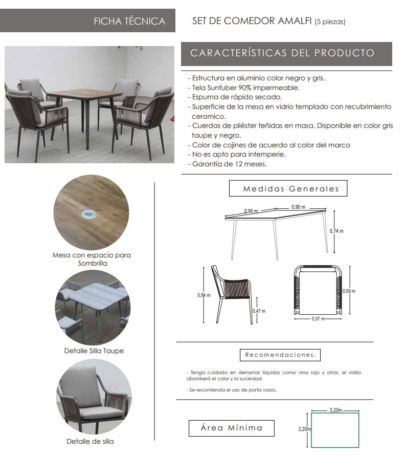 Mesa: 90cm x 90cm x 74cm (ancho x profundo x alto)