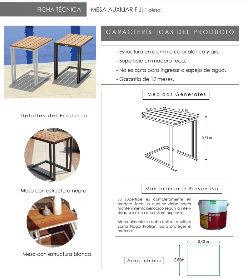 Base en aluminio de color blanco o negro, con una superficie con tablones de madera teca. Estas mesas de exterior tiene un diseño en forma de C, que permite ubicarla entre un mueble o en una asoleadora. La madera teca es un producto natural y debe lubricarse de manera periódica con productos especiales para este tipo de madera