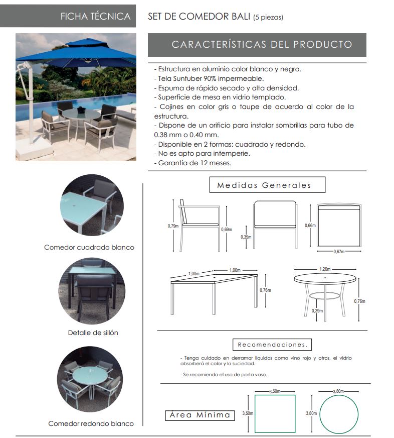 Estructura en aluminio, superficie en vidrio templado, cojines con espuma de alta densidad y tapizados con tela Sunfiber.