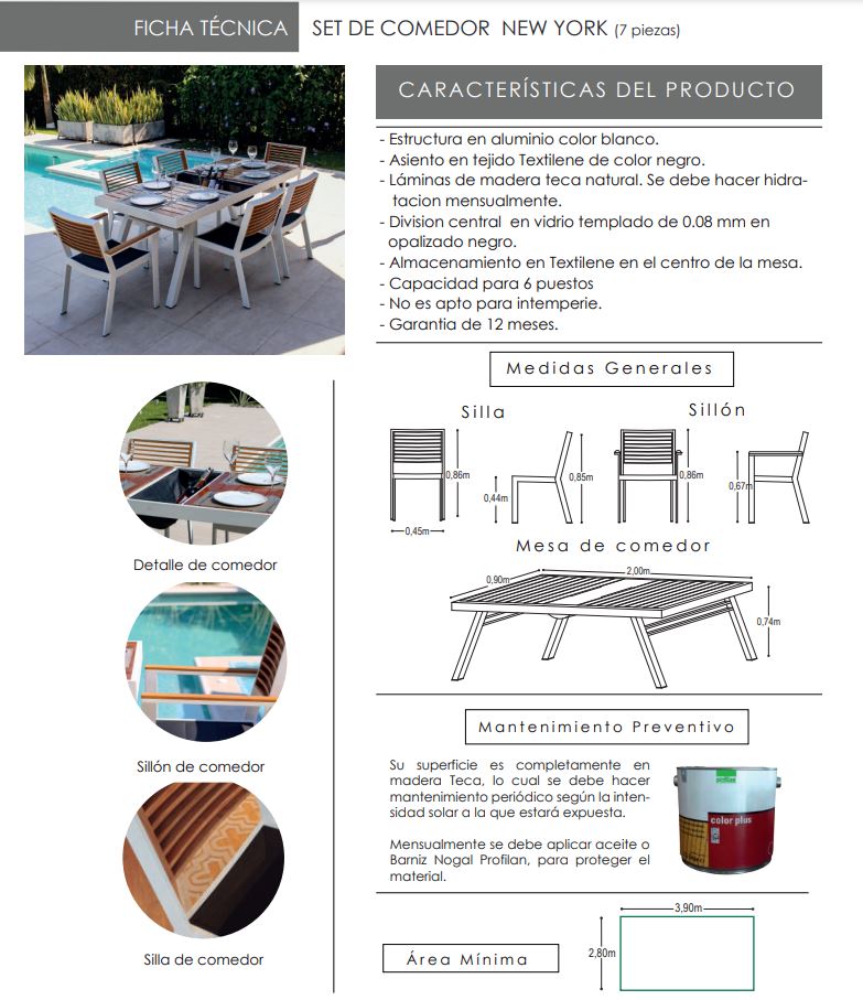 Estructura en aluminio, madera Teka, incrustación en vidrio templado y tela textilene.
