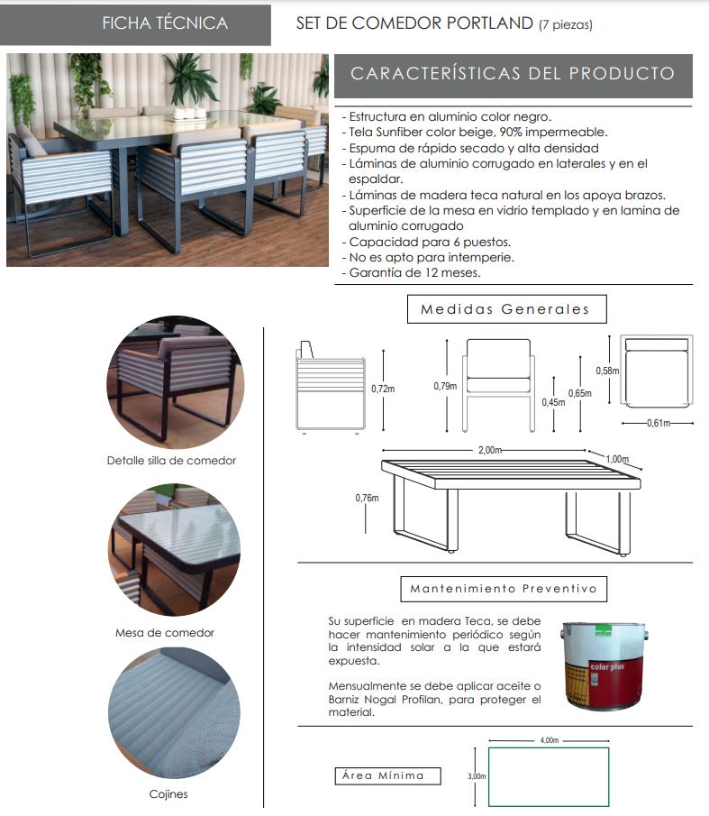 Estructura en aluminio de aplicación exterior, láminas de aluminio corrugado, superficie en vidrio, láminas de madera teka, cojines con espuma de alta densidad, tapizados con tela Sunfiber.