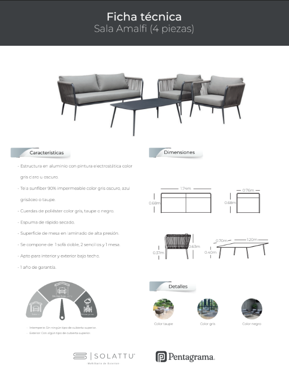 Este set de sala hace juego con el set de comedor Amalfi cuadrado de 4 puestos o rectangular de 6 puestos.