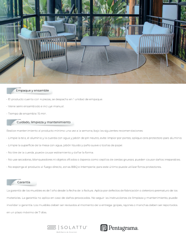 Este juego de sala es ideal para espacios exteriores, gracias a la resistencia y durabilidad de sus materiales, lo que lo convierte en una opción perfecta para terrazas. Las cuerdas de poliéster decoran el mueble de manera elegante y moderna.