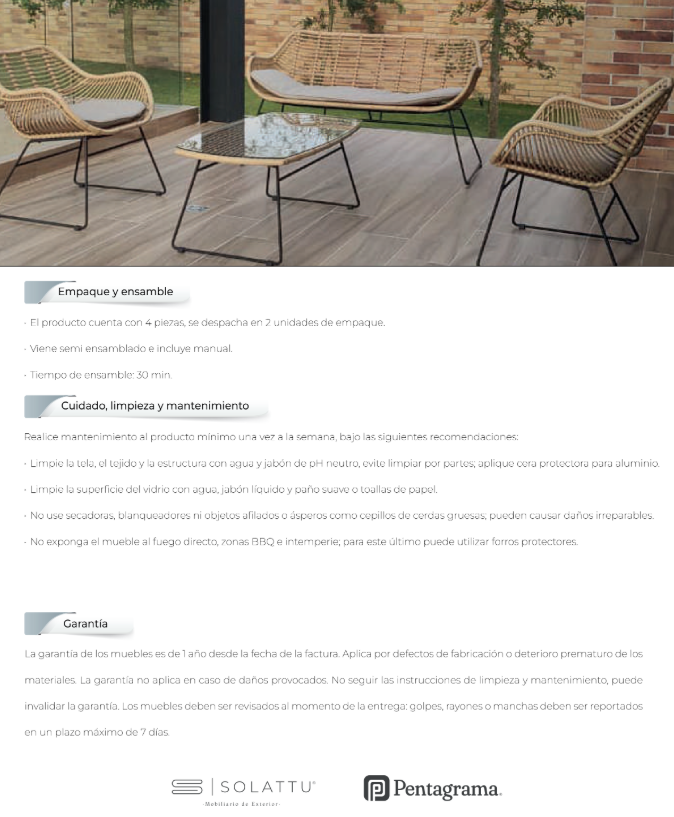 - Se compone de 1 sofá doble, 2 sencillos y 1 mesa.