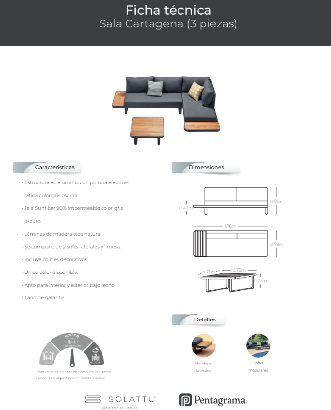 - Sofás laterales (2): 176 cm (ancho) x 79 cm (profundo) x 65 cm (alto).