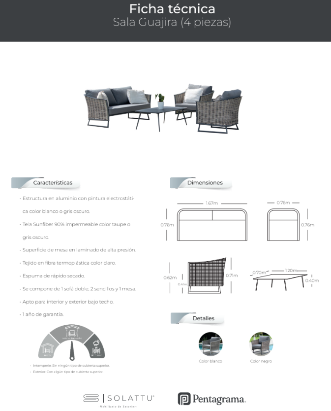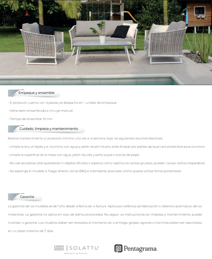 Este set es ideal para exteriores protegidos (no para intemperie), ya que está diseñado con materiales resistentes y ligeros que aseguran durabilidad. La estructura elevada evita que el mueble entre en contacto con el suelo, reduciendo la suciedad. La mesa de centro cuenta con una superficie de laminado de alta presión con recubrimiento cerámico, simulando el elegante acabado del mármol.