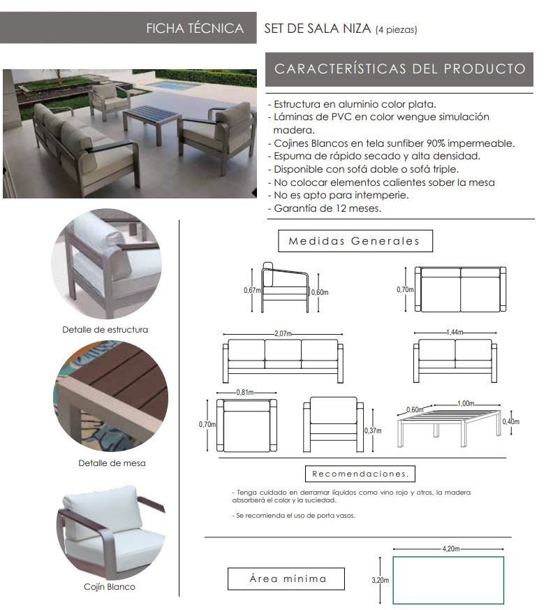 Único: estructura color plata, cojines blancos, detalle en madera oscura.