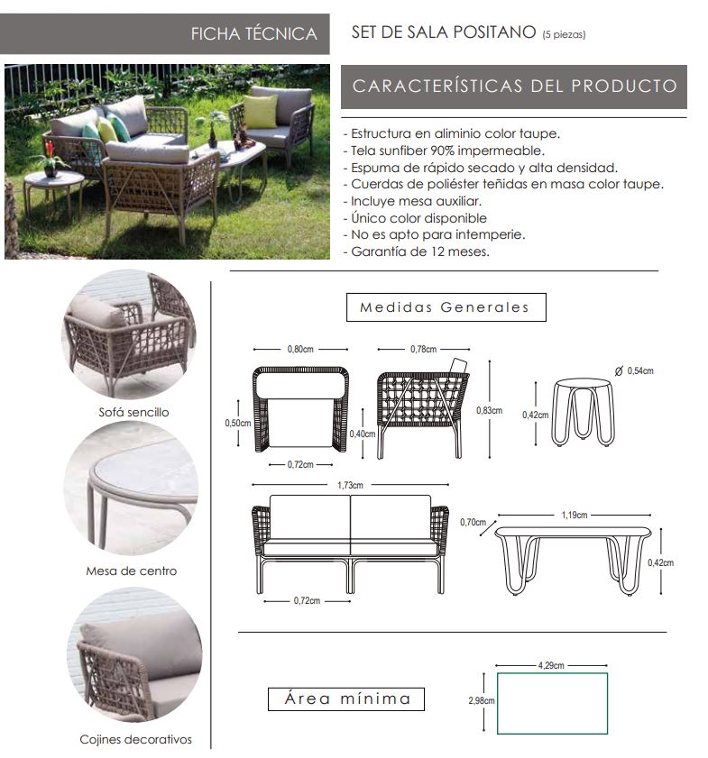 Único: estructura, cuerdas y cojines color taupe. Superficie en simulación mármol gris.
