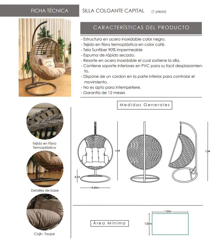 La silla colgante Capital tiene cómodos cojines con descansabrazos en tela Sunfiber, una tela de muy alto desempeño e ideal para uso exterior.