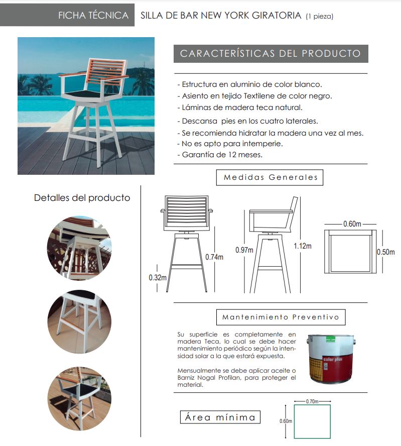 Esta silla de exterior alta es giratoria lo cual la dota de un alto grado de funcionalidad y dinamismo. Tiene un diseño muy urbano y es ideal para barras y mesas de exterior altas. El diseño hace parte de la misma línea de la colección New York que está disponible también en Set de comedor y Set de sala.